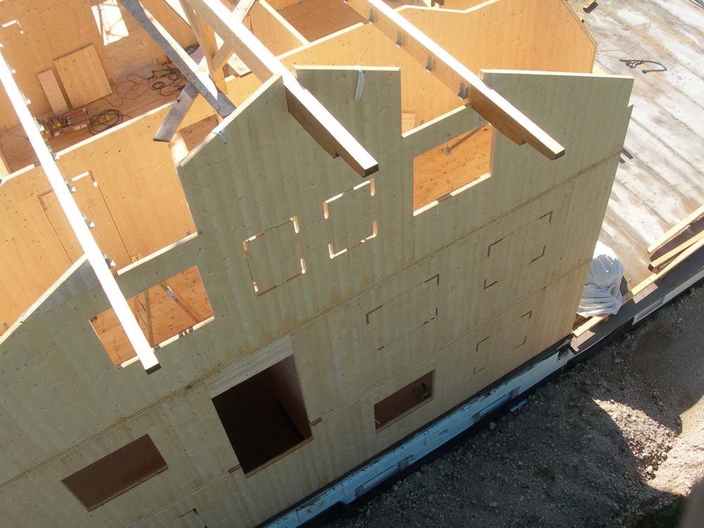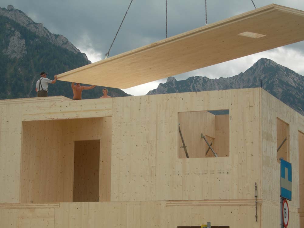 Im Massivholzbau werden die Holzelemente (Wand-, Decken- und Dachplatten) in der Werkstatt maßgenau vorgefertigt und vor Ort montiert. Je nach Funktion und gestalterischen Wünschen können sie ein- oder mehrschichtig gedübelt, genagelt oder kreuzweise verleimt werden. Außen bringt man eine Dämmschicht an, im Innenbereich werden die Platten verkleidet. So bekommt das Haus eine durchgehende, wärmebrückenfreie Hülle.